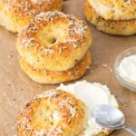 Storing: To store, place the cooled almond flour bagels in an airtight container and store in the refrigerator. I recommend slicing the bagels into half length-wise and then toasting them before eating.