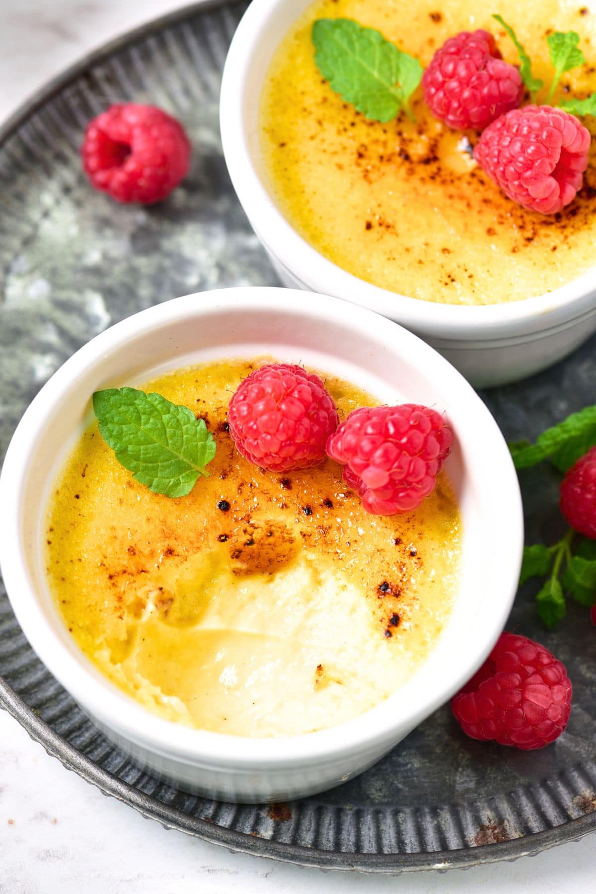 - Garnish and Serve: Garnish the crème brûlée with fresh berries, fresh mint and serve.