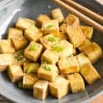 If you don’t plan on eating the tofu straightaway, place it in an airtight container and store it in the refrigerator for 4 to 5 days. When planning on eating, simply pop the tofu in to the air fryer at 350F for a couple of minutes to heat it up before enjoying!