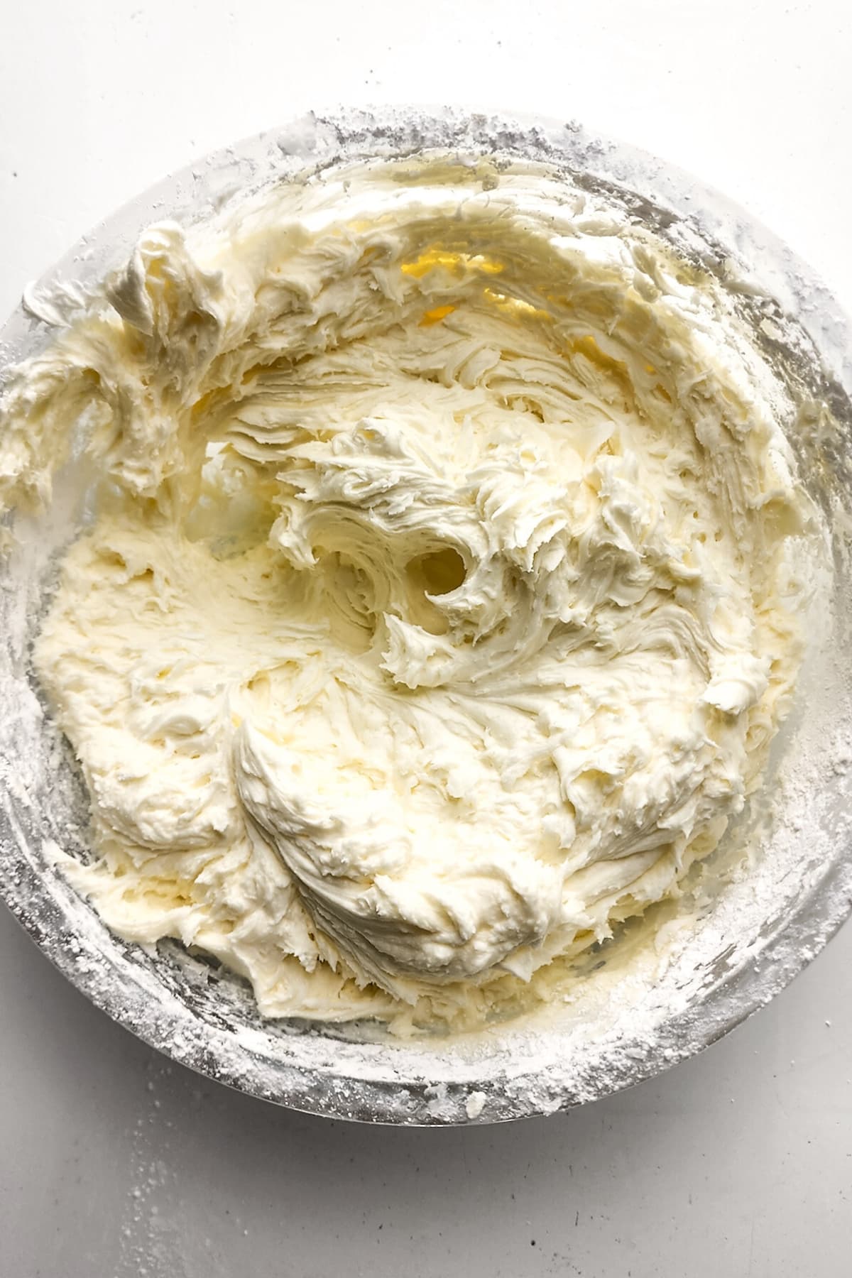 Use a hand mixer to blend together until smooth. Add the sifted powdered sugar about 2 cups at a time, blending in between each addition.
