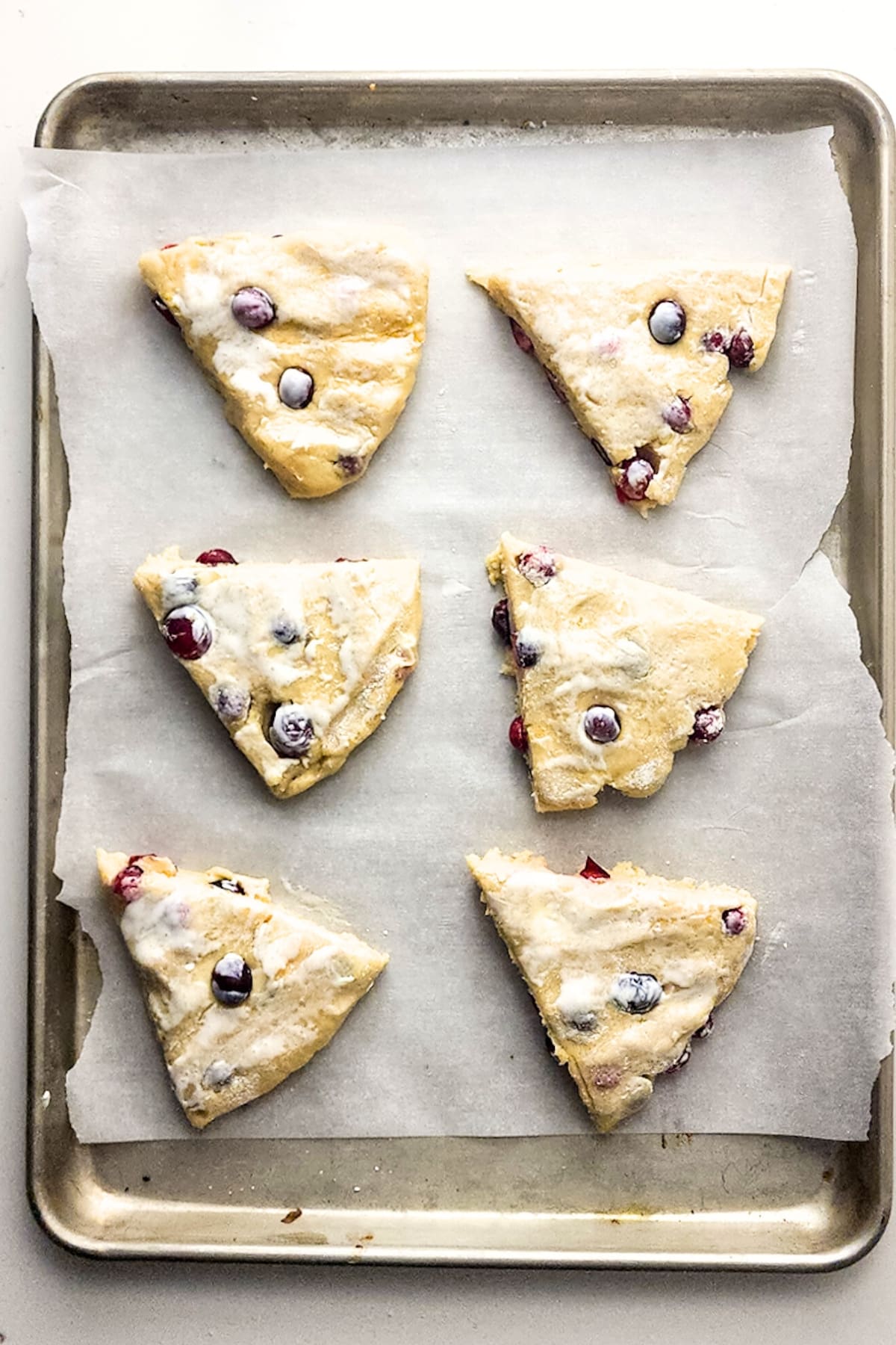 Brush each scone with a little heavy cream and place some extra cranberries on top of the scones.
