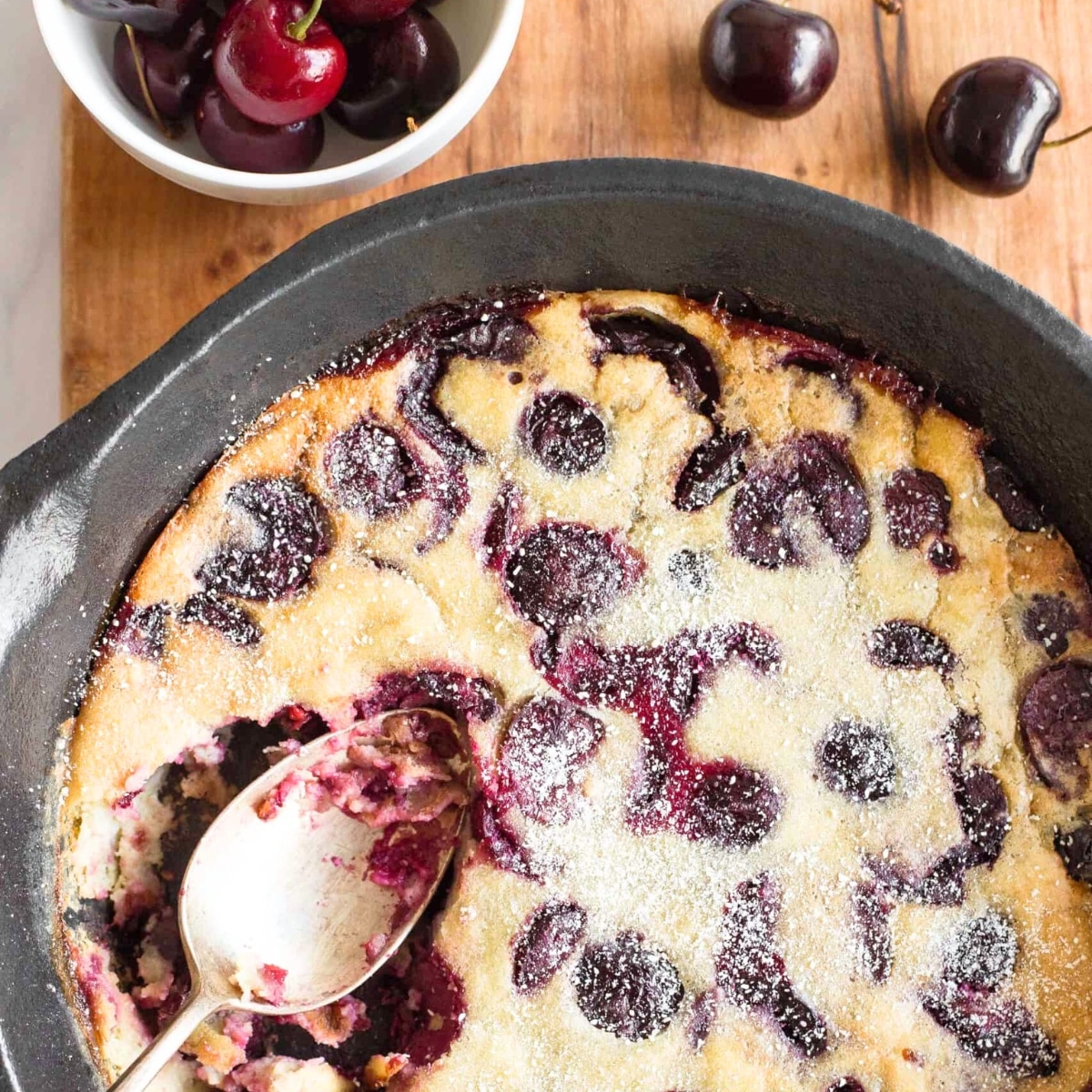 This deliciously easy gluten-free clafoutis is filled with sweet, juicy cherries, puffed and golden at the edges, and dusted with finely shredded coconut. This quick cherry dessert comes together in just 30 minutes, cooks in just one skillet, and you can use fresh or frozen cherries too. Dairy-free too, but you wouldn’t know it!