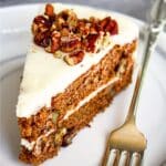 This incredibly moist gluten-free spice cake is flavored with warm spices, has a tender crumb filled with crunchy pecans, and is spread with a delicious cream cheese frosting for a decadent treat. Totally dairy-free too. Go bake this beautiful cake today – it’s the perfect dessert for the holidays!